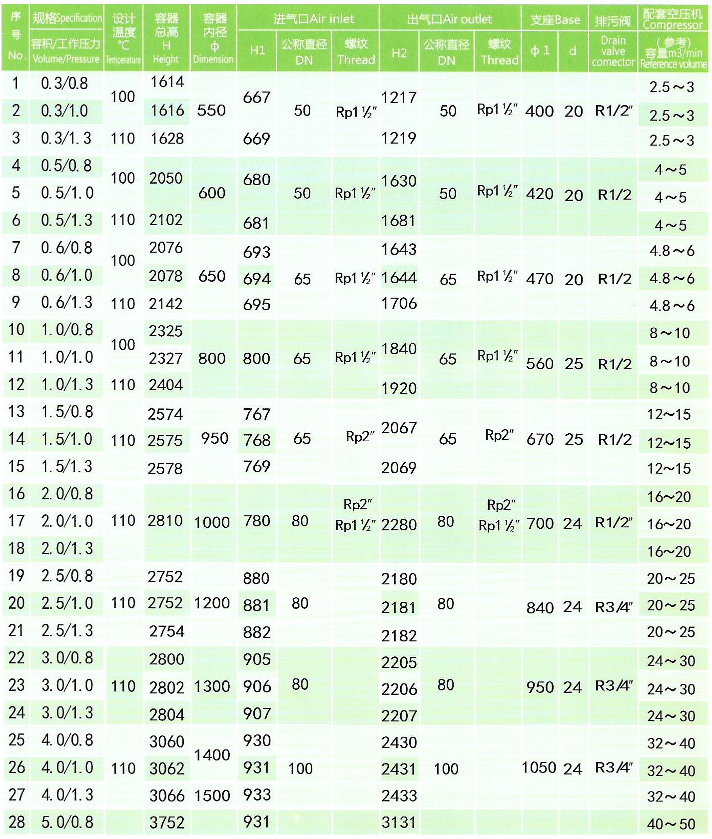 2、排氣量在6~10m3/min以下使用1500L~2000L儲氣罐。